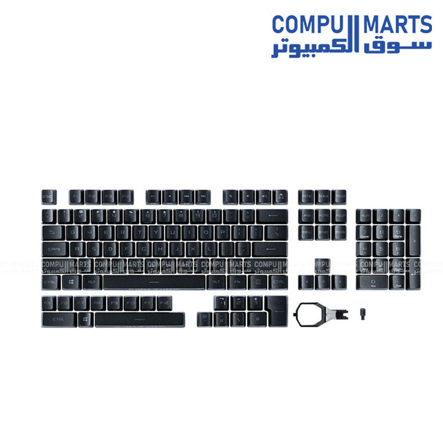| محتويات | 123 غطاء مفاتيح PBT مزدوج الطبقة، 20 مثبتًا، أداة سحب أغطية مفاتيح ROG، دليل المستخدم |